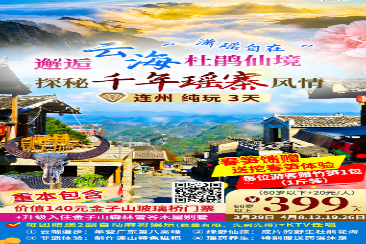 【逍瑶自在】【金子山云海杜鹃.升级1晚森林木屋别墅】广州往返连州千年瑶寨纯玩3天