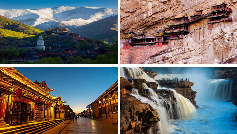 王牌景点 :世界文化遗产-平遥古城;四大佛教名山之首、智慧文殊菩萨的道场-五台山;三大石窟之一-云冈石窟;民间故宫-乔家大院;黄河之水天上来,千里黄河一壶收-壶口瀑布;天然氧吧-云丘山 ;