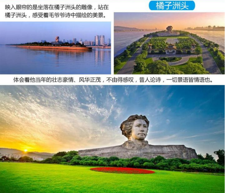 15:30-17:30 游览【橘子洲头】 (游览约 120 分钟),游览位于湘江江心、世界最大城市内陆洲、青少年毛泽东在湘江 游泳时的休息地、也是《沁园春 ·长沙》中提及到的橘子洲头,在指点江山石前激扬文字,感受一代伟人豪迈情怀。 17:30-18:00 游览后乘车返回,结束愉快行程。(行程中所标注时间仅为参考,受气候,路况,节假日,景区排队与管 控等不可抗力因素会发生变化和调整,敬请理解) 17:30-18:00 游览后乘车返回入住酒店。