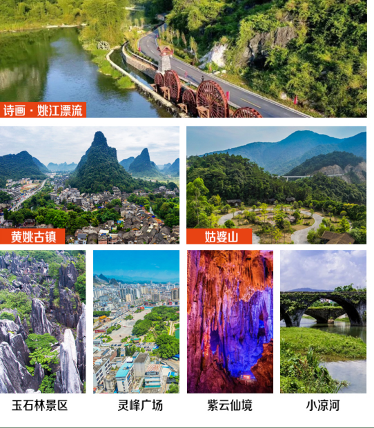【诗画·姚江漂流】(游览时间约1小时):以“诗画田园·情定姚江”为主题,以爱情和浪漫为主打旅游目的地,集竹筏漂流、水上乐园、陆地骑行、儿童游乐、美食体验、休闲度假、和健康养生于一体的综合旅游度假区。游览方式:乘坐人工划动的竹筏,慢慢的静漂于姚江上欣赏美景;沿着姚江绿道,慢游中欣赏姚江两岸美景。【黄姚古镇】(游览时间约2小时):被评为“中国最具旅游价值古城镇“、“中国最值得外国人去的50个地方之一”堪称“诗境家园”。在景区可领略明清两代的特色建筑(广西省工会旧址,自治区级重点文物保护单位)古戏台、龙爪榕、宝珠观、鲤鱼街、八仙睡榕、岭南第一石板街等。镇内的建筑按九宫八卦阵势布局,属岭南风格建筑,与周围环境形成一体,被称为“人与自然完美结合的艺术殿堂”。