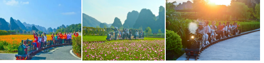 打卡网红【蒸汽小火车】(此项目可自愿自费参加,参考价格20元/人/程)穿越花田、桃林、湖面的水上观光小火车,长约3公里,可同时乘坐20人,行驶约半小时,是世界上在运营的最慢小火车,坐在哐当哐当行驶的小火车上,悠然尽赏峰林水乡醉美风光,人在画中游,赶紧拍一个让你点赞无数的抖音小视频或者来一组刷爆朋友圈的大片吧!