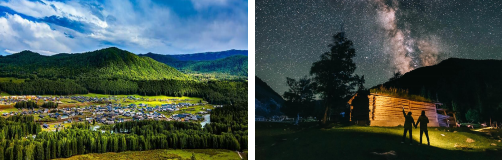 和的阳光洒在一栋栋图瓦小木屋上,暮归的牛群一群群走过禾木桥;晴朗的夜晚,待漫天繁星时,抬头仰望,银河