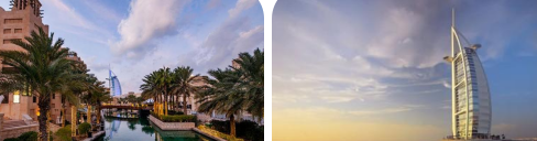 外观【帆船酒店】:Jumeirah海滨天然浴场上外观全世界最奢华的号称7星的帆船酒店,又称“阿拉伯塔”酒店。其凭借独特的外观造型及金碧辉煌、奢华无比的装饰、全智能化的管家式服务,享誉全世界。酒店规定,需持有酒店所提供的服务预定号方能入内参观。