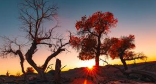 和日落日出结合 ,看沙漠驼影与大漠边缘的豪迈胡杨。