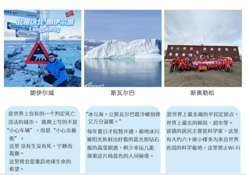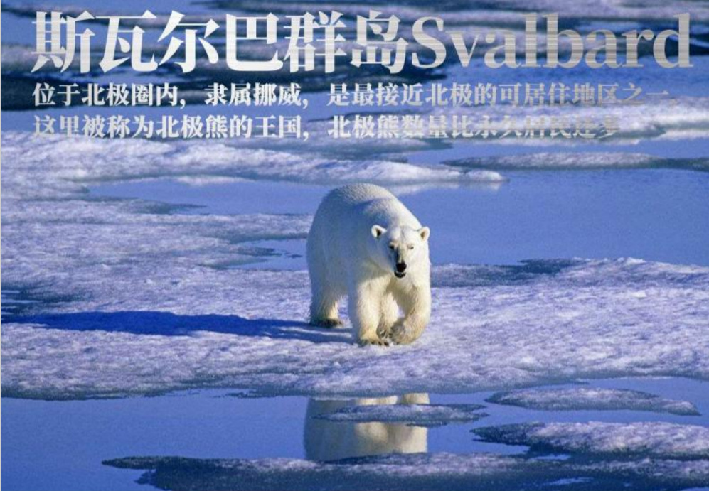 斯瓦尔巴群岛:此岛全部位于北极圈内, 隶属挪威 ,号称北极熊的王国。我们将抵达新 奥勒松 ,它被称为世界上最北端的定居点 ,也是许多国家北极科考站所在地 ,您还将有 机会在”黄河站“前留影;