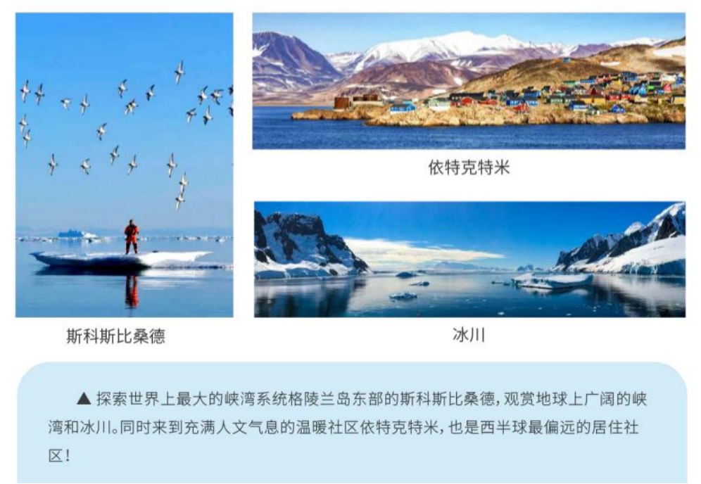 东格陵兰:探索世界上最大的峡湾系统格陵兰岛东部的斯科斯比桑德 ,亲历其境, 观赏 地球上广阔的峡湾和冰川。 同时来到充满人文气息的温暖社区依特克特米 ,也是西半球 最偏远的居住社区;