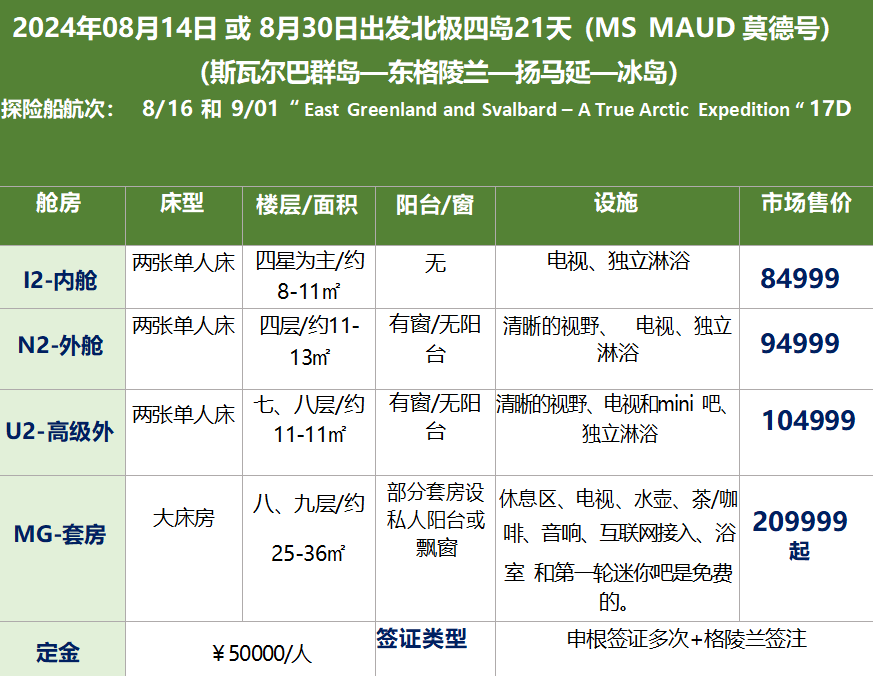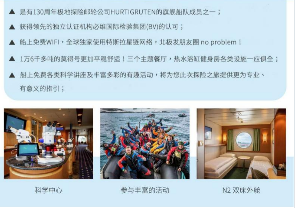鉴于探险游轮行程的特殊性 ,即在极区以及偏远地区航行时 ,您的探险队必须靠海况、冰情和天气的指引来确 定路线和行程。因此如下提供的行程 ,是对您本次行程的初步说明。敬请注意 ,没有任何一个特定登陆点是可 以完全确定的。同理 ,行程中提到的偶遇野生动物 ,是我们所期待的 ,但并不能保证实现。探险队将用他们的 丰富经验在已知的栖息地寻找野生动物的踪迹,但是,我们并不能保证会遇见任何特定种类的鸟类或海洋生物。 实际行程会跟据当时的天气或浮冰 ,在以游客安全为首要前提下可能产生调整或者变更 ,以船长和船方决定为 准 ,最终解释权归船方所有,尽情谅解配合!