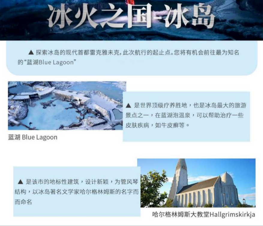冰岛: 探索冰岛的现代首都雷克雅未克, 此次航行的起止点。您将有机会前往最为知名 的”蓝湖Blue Lagoon“;
