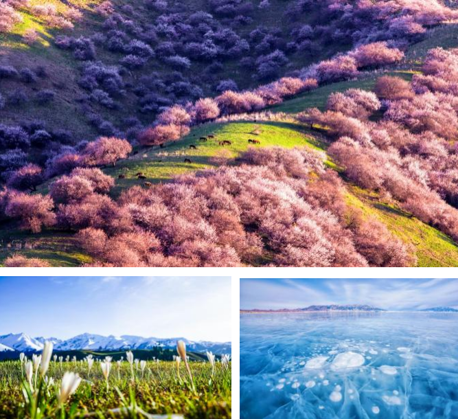 2 个大 IP·春意与冰雪交织:赛里木湖半湖脂玉半湖蓝,那拉提草原雪水涓涓绿意涌动,顶冰花破冰而出;