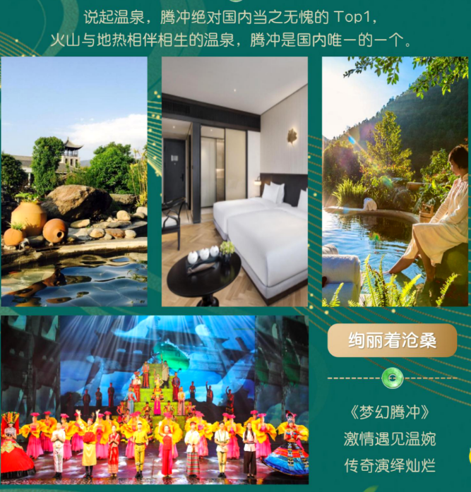 【梦幻腾冲】赠送欣赏大型史诗极边绝唱《梦幻腾冲》(此项目为赠送项目如遇停演或取消,费用不退哦),饱吸了祖国边陲腾越大地的自然资源和人文资源,以国际水准的现代艺术手法,气势恢弘、美轮美奂地展示了腾冲的地域特色和历史文化魅力(如遇梦幻停演或取消,时间允许的情况下我们将为您替换为游览 3A 级景区珍奇古木博览园,带您领略国内唯一一家以珍稀古木、古树根鉴赏为主的博览园)