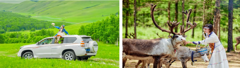 【行程安排】早餐后,乘越野车穿越草原,深入草原腹地,沿途抵达【莫日格勒制高处】,俯瞰日格勒河,一条蜿蜒曲折的河水,她就仿佛是草原上一条盘旋的玉娇龙,每天在草原上尽情地展现着自己的妩媚身姿。当你负手站在草原上看着莫日格勒河潺潺的流水,你会觉得心态平和,有一种温婉的感觉……【赠送无人机航拍】(拍摄时间约10分钟,赠送1分钟左右视频成片,如遇天气不好,将取消此项目,不退费用),多角度拍摄莫日格河畔最美的草原景色……后继续穿越草原,自由奔跑,尽情的享受蓝天、白云、草原、牧歌,令人陶醉的大自然,肆无忌惮的放飞心情……后换乘旅游巴乘车前往位于大兴安岭深处的【根河市】,参观位于大兴安岭深处的、原生态的【鄂温克驯鹿部落】,敖鲁古雅鄂温克族猎民是根河市最早的开发者,400多年前敖鲁古雅鄂温克猎民就生活在额尔古纳河畔,大兴安岭的北部。安排【围炉煮茶】,围桌而坐,品尝着鄂温克族特色茶点,听听猎民讲讲发生在他们身边的故事,与驯鹿近距离接触,体验敖乡的文化……晚餐后,入住酒店。