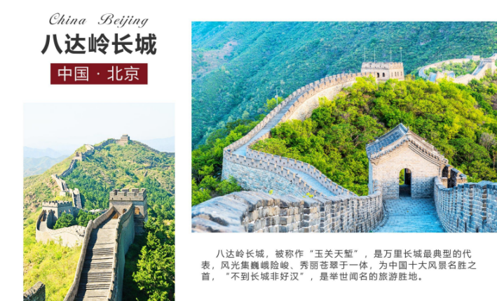 .【八达岭长城】游览: 2 小时。八达岭长城雄伟险峻 ,被称作“玉关天堑”,是万里长城最典型的代表, 为中国十大风景名胜之首,被联合国教科文组织列入《世界文化遗产名录》。这座举世闻名的旅游胜地, 是接待外国元首和国际友人最多的中国景点。毛主席曾写到“不到长城非好汉 ,屈指行程二万”,在八 达岭长城上 ,建有“好汉坡”,是游客攀爬的一个目标终点。重大节庆日 ,景区还会举办灯光秀表演。