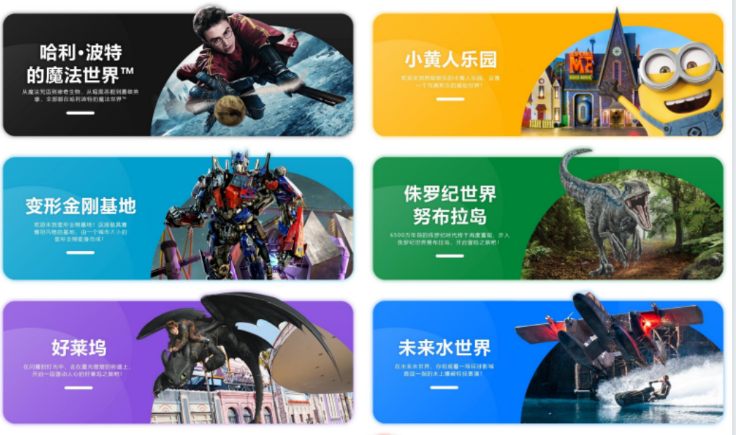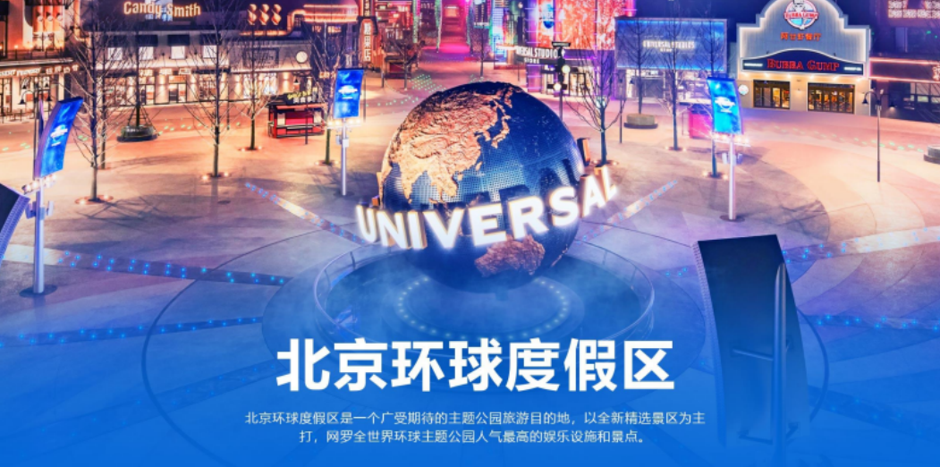 .【北京环球影城】北京环球影城度假区是一个源于美国好莱坞的世界级电影主题公园,是全球最大的环 球影城 ,占地 4 平方公里,是日本环球影城的 5 倍,总投资超过 1000 亿人民币。北京环球影城是亚洲 第三家、世界第五家环球影城 ,为世界各地游客提供沉浸式的娱乐体验。 景区含: 7 大主题景区、24 场娱乐演出、37 处地标景点、80 家餐饮及零售门店 ,还有全球唯一为中国设计的孙悟空、功夫熊猫元 素景区 ,深受电影迷和年轻人的喜爱 ,下午有花车巡礼 ,晚上有大型烟花秀表演。