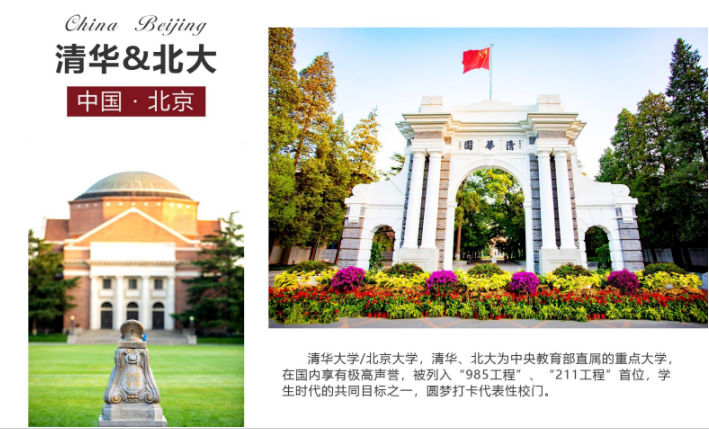 .【预约进清华+清华艺术馆+学士服拍照+赠送清华校徽】时间: 2 小时。个人参观清华为实名预约制, 预约方法在行程最后,请提前七天预约,预约不成功视为放弃。所有人可参观清华艺术馆,再换装清华 大学学士服拍照,在孩子心中埋下一颗想考取清华的种子,赠送每个孩子一枚清华大学校徽留念。清华 艺术馆为国家一级博物馆 ,国际一流艺术馆 ,收藏有中外名画和艺术品 ,2008 年入藏清华的两千余片 “清华简”为博物馆的镇馆之宝 ,还有张仃参与设计的国徽、世博会中国馆的设计草图。