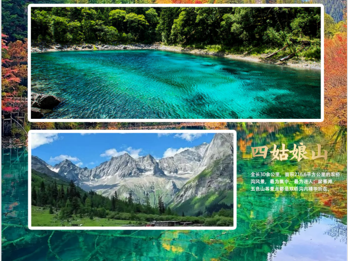 【精华景点】:国宝萌宠-卧龙熊猫苑、童话世界-九寨沟、东方阿尔卑斯山-四姑娘山,人间瑶池-黄龙