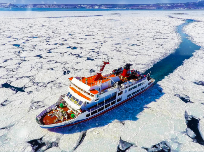 【网走破冰船体验】(含船票)流冰游船能深入冰封鄂霍次克海,提供难能可贵的机会,让您能在舒适、安全的破冰船上,近距离观赏无与伦比的自然现象。流冰是从俄罗斯的阿尔穆河河口一路往南漂移,通常会在一月底前到达,一般来说,网走周围的流冰最厚,并且会在三月底消退,若要更深入了解流冰知识,可到纹别与网走参观流冰博物馆。