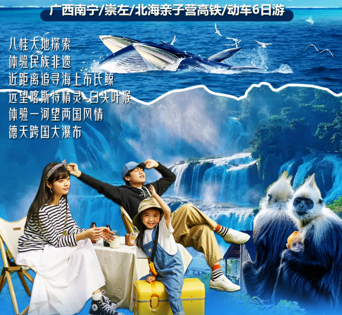 涠洲岛火山地质科考,体验壮乡生活砍甘蔗(或水果采摘),做一次地道的广西本地人,认识侏罗纪时代就存在的植物,望远镜观白头叶猴(发放研学证书)寻找比大能猫数量还少的白头叶猴、感受中越跨国德天瀑布的磅礴气势、海上近距离观察布氏鲸 品尝南宁老友粉/簸箕宴/农家特色餐/海鲜餐/篝火BBQ